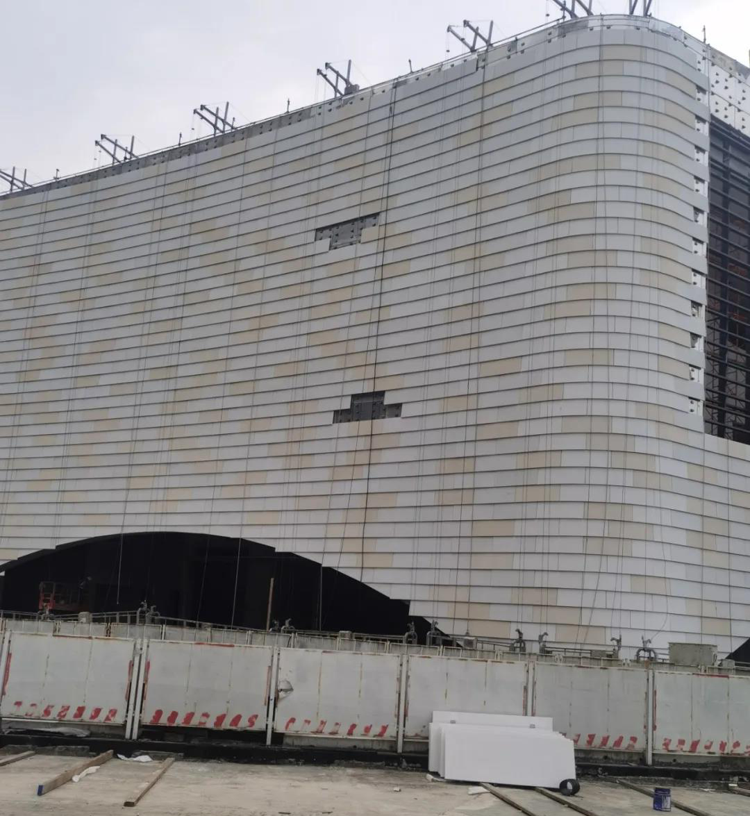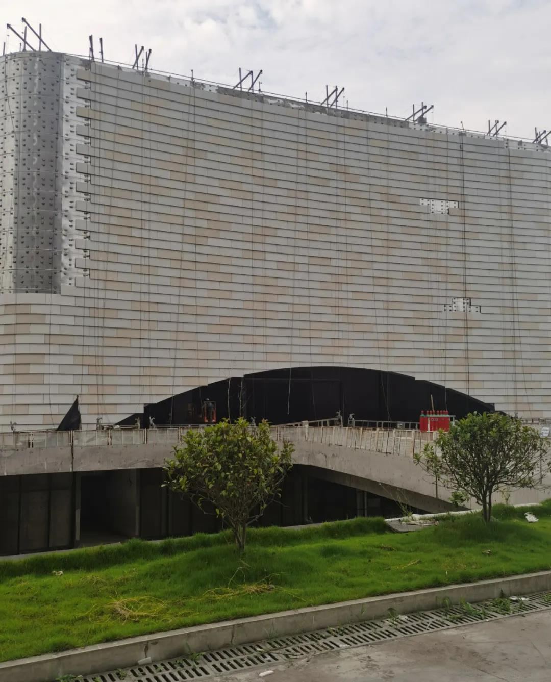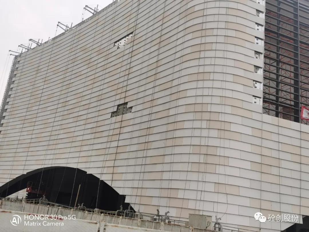 建筑外立面材料采用“砼創(chuàng)品牌”的高強混凝土板塊,由荔枝紋漸變淺黃色間隔拼接組成,應(yīng)用面積近18000㎡。