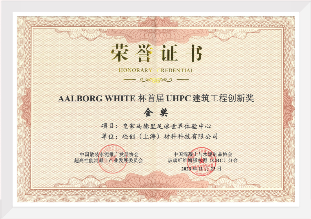 砼創(chuàng)(上海)新材料科技有限公司在此次參賽中摘得一金一銀的好成績。UHPC參賽項(xiàng)目:皇家馬德里足球世界體驗(yàn)中心,獲得“首屆UHPC建筑工程創(chuàng)新獎-金獎”;GRC參賽項(xiàng)目:寧波工業(yè)互聯(lián)網(wǎng)研究院產(chǎn)業(yè)園獲得“首屆GRC建筑工程創(chuàng)新獎-銀獎”。