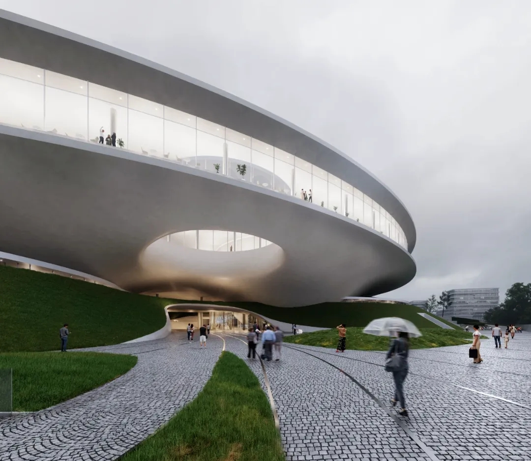 一二層被設(shè)計(jì)為城市綠丘,與底層整體架空,為現(xiàn)實(shí)的城市空間提供一個(gè)立體市民公園。參觀者可以從城市步行至建筑中心,然后抵達(dá)山頂。在這里,創(chuàng)享中心的展覽、會(huì)議、配套及其他設(shè)施都被巧妙地連接在一起。三四層則是一個(gè)看似從未知星際的太空飛碟坐落山間的懸浮空間,內(nèi)部包含主展館和會(huì)議中心。這個(gè)外部環(huán)形且內(nèi)無邊界的設(shè)計(jì),擁有極高的靈活性,可以為虛擬現(xiàn)實(shí)展品提供隨心所欲的展示場地。